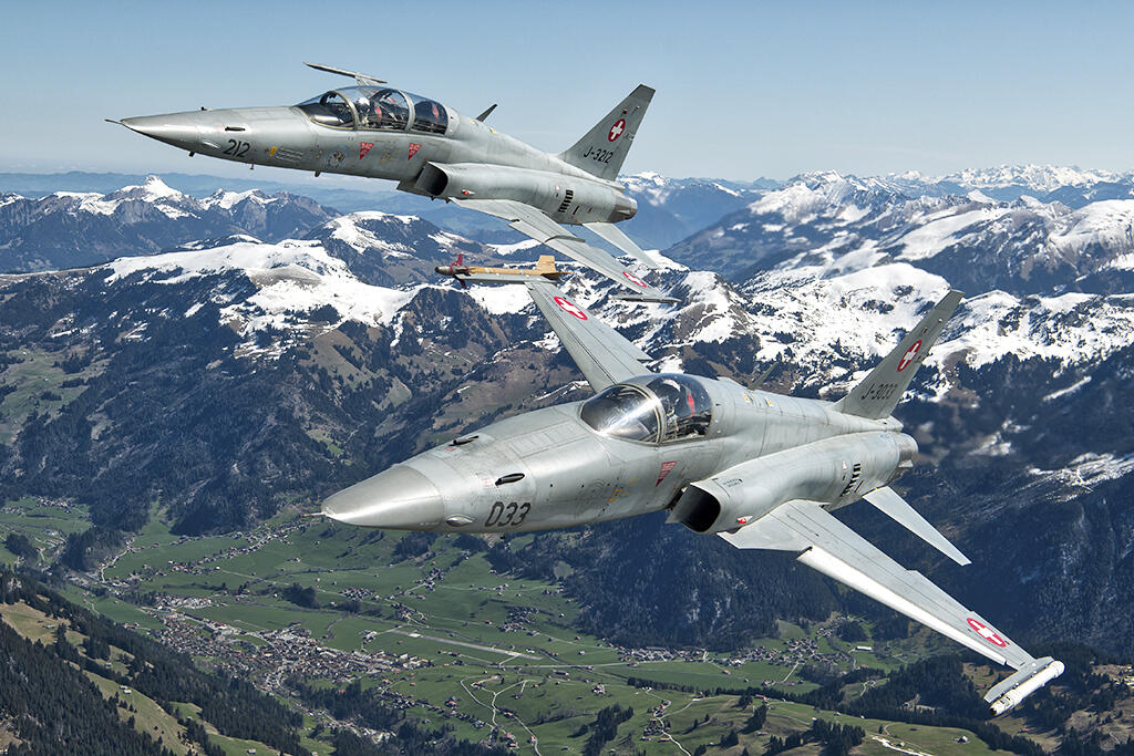 A pair of Swiss air force Northrop F-5E/F Tigers fly over the Alps.