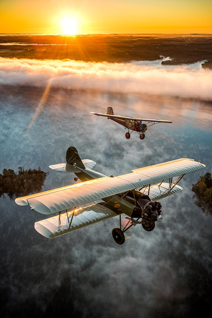 Curtiss-Wright Robin flown by Scott Glover, Curtis Wright Travel Air 4000 flown by Kelly Mahon, O-1 Bird Dog photo ship flown by Matt Bongers, Mount Pleasant, Texas, for the Mid America Flight Museum.