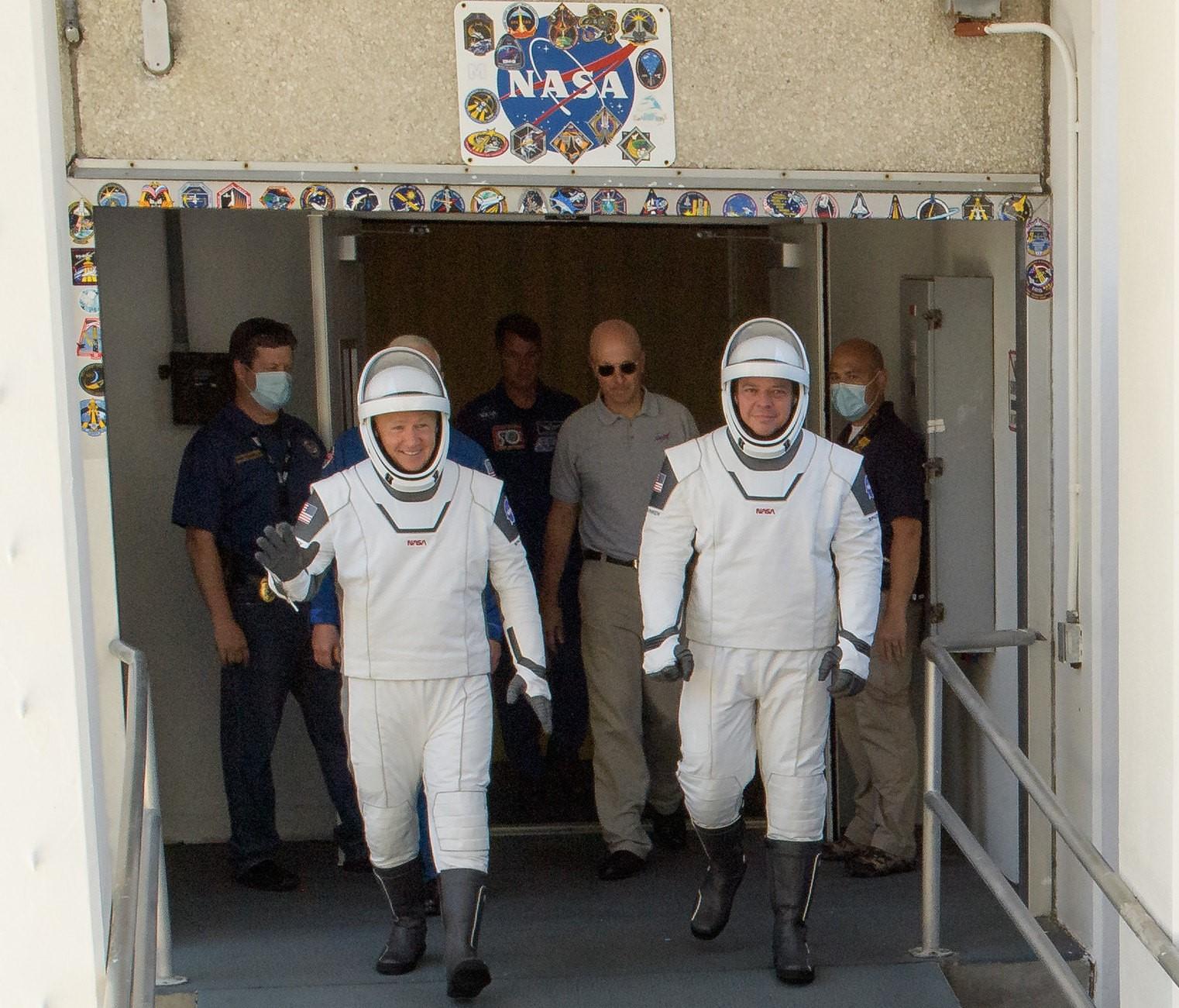 Veteran NASA astronauts Robert Behnken and Douglas Hurley donned their sleek, black-and-white, one-piece pressurized flight suits, walked out from crew quarters, bid goodbye to their families and climbed into the back seats of a Tesla Model X sport utility vehicle provided by SpaceX’s sister company, Tesla, for a ride to the launchpad.