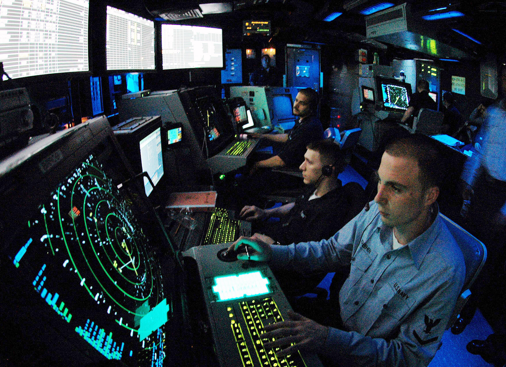 Most controllers do no actually see the aircraft they are managing. Once an aircraft leaves the terminal airspace, the management is then transferred to an enroute controller who will then manage the aircraft. These controllers are located at Air Route Traffic Control Centers and manage traffic on radar screens at 21 different locations throughout the country. Pictured here is a military air traffic controller in Carrier Air Traffic Control Center. (Photo Credit: US Navy)