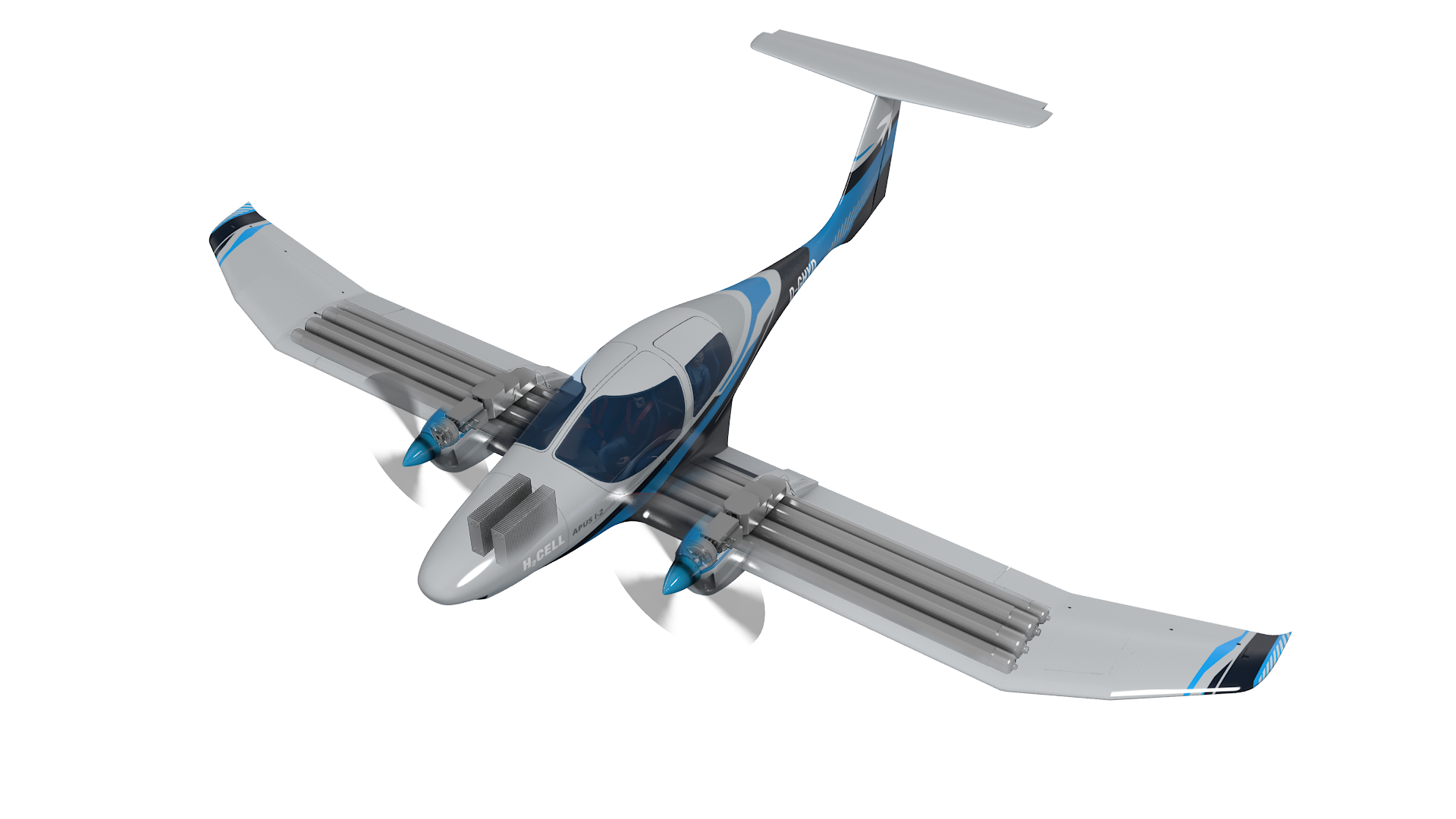 The aircraft will have two fuel cells in the nose, driving two wing-mounted electric propulsion units that are boosted by high-voltage batteries also housed in the nacelles. The pressurized gaseous hydrogen will be stored in tubes integrated into the wing.