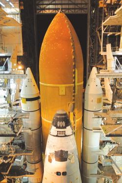 The speckled nose of shuttle Atlantis's external tank shows some of the nearly 2,500 hail-damaged areas repaired in the Vehicle Assembly Building at the Kennedy Space Center, as the STS-117 stack moves out of the building and back to Pad 39A on May 15. Kennedy and United Space Alliance personnel at...