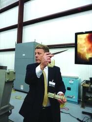 Tom Hurn, project manager for General Atomics’ railgun program, demonstrates the trajectory of the company’s experimental Blitzer railgun on the occasion of the December test firing at the U.S. Navy’s Dahlgren test center (DTI January, p. 16).